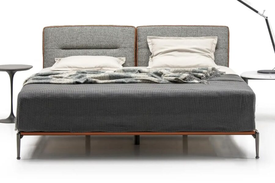 Основание кровати Casablanca выполнено максимально легким и изящным. Тонкая царга, обтянутая той же коньячной кожей, что и кант, создает ощущение целостности и завершенности дизайна. Кровать словно парит в воздухе благодаря тонким, но прочным алюминиевым опорам. Такое конструктивное решение не только придает силуэту динамику, но и визуально расширяет пространство спальни, делая интерьер более воздушным.