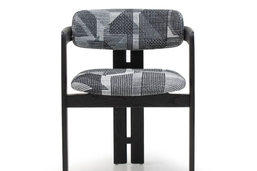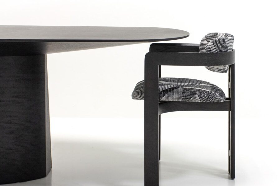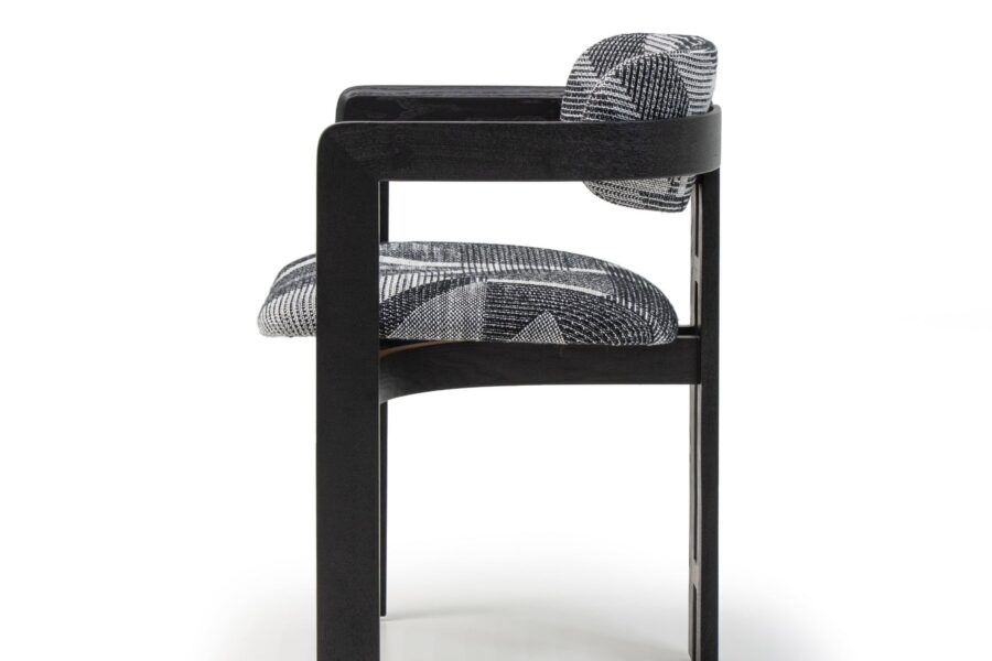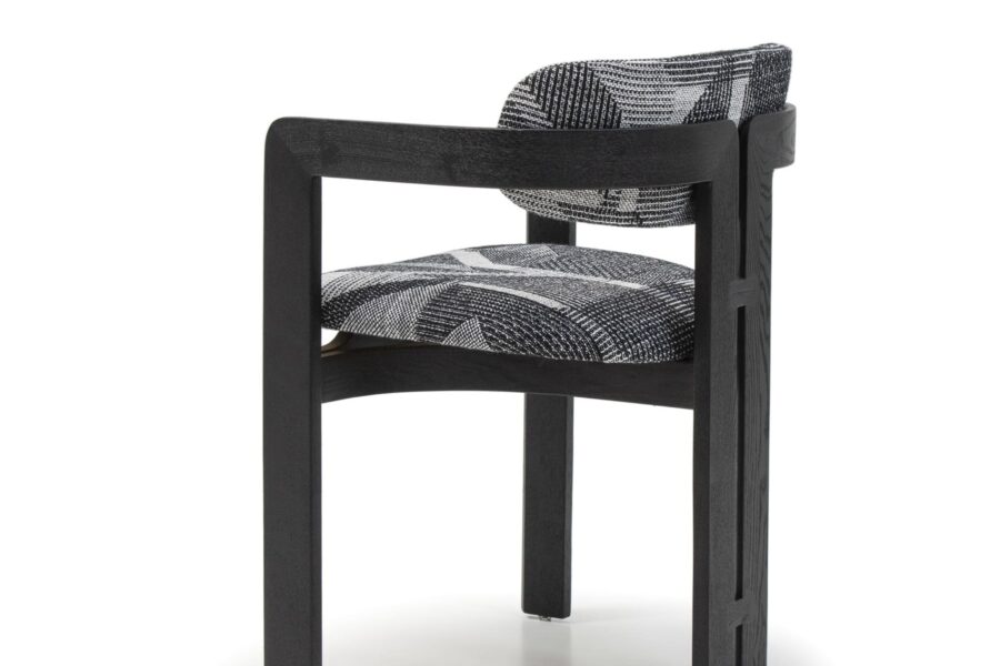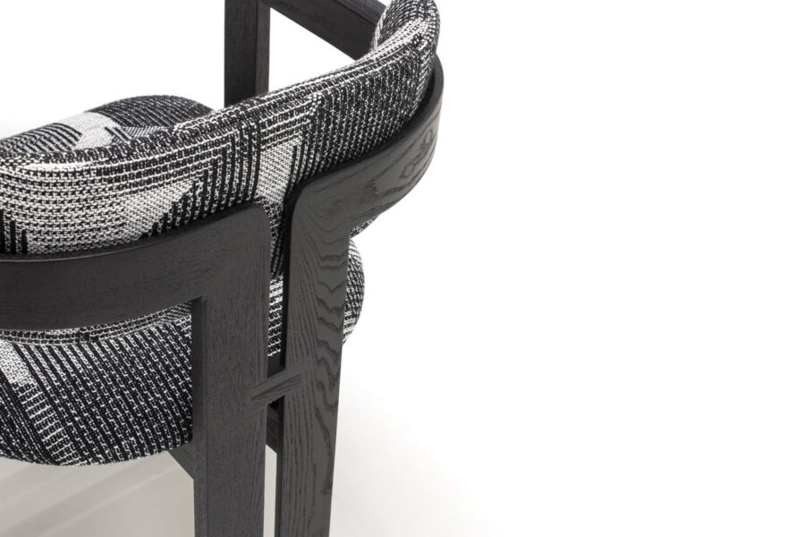 Основа стула — его элегантный каркас из ясеня с глубокой тонировкой «черный уголь» демонстрирует благородную текстуру натурального дерева. Главный конструктивный элемент – широкая задняя опора с вертикальными прорезями. Это не просто декоративный прием — это игра с массой и пространством, светом и тенью, которая делает конструкцию визуально проницаемой и динамичной. Монолитная форма подлокотников подчеркивает целостность и основательность всей структуры.